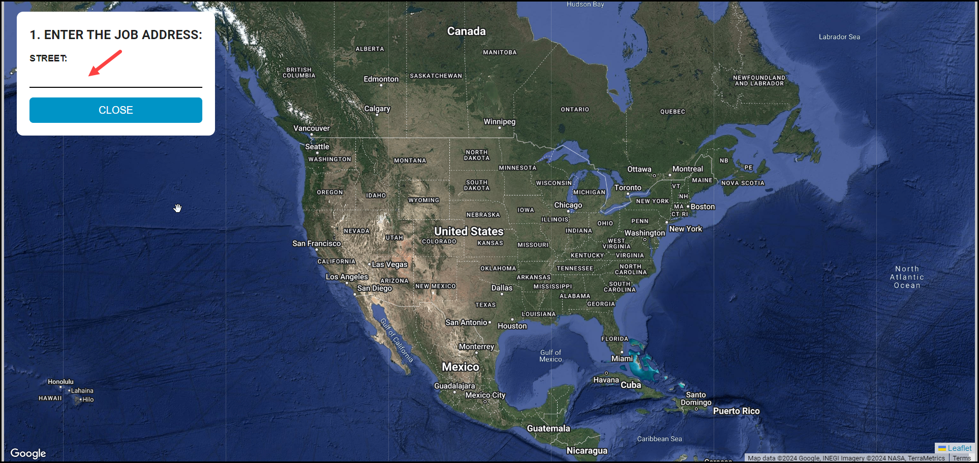 2. Define the job are by clicking the Enter Stage Address field. This step is simply telling the map where to load on subsequent Products. Clicking the "Enter Stage Address" box opens Bitumio Maps.