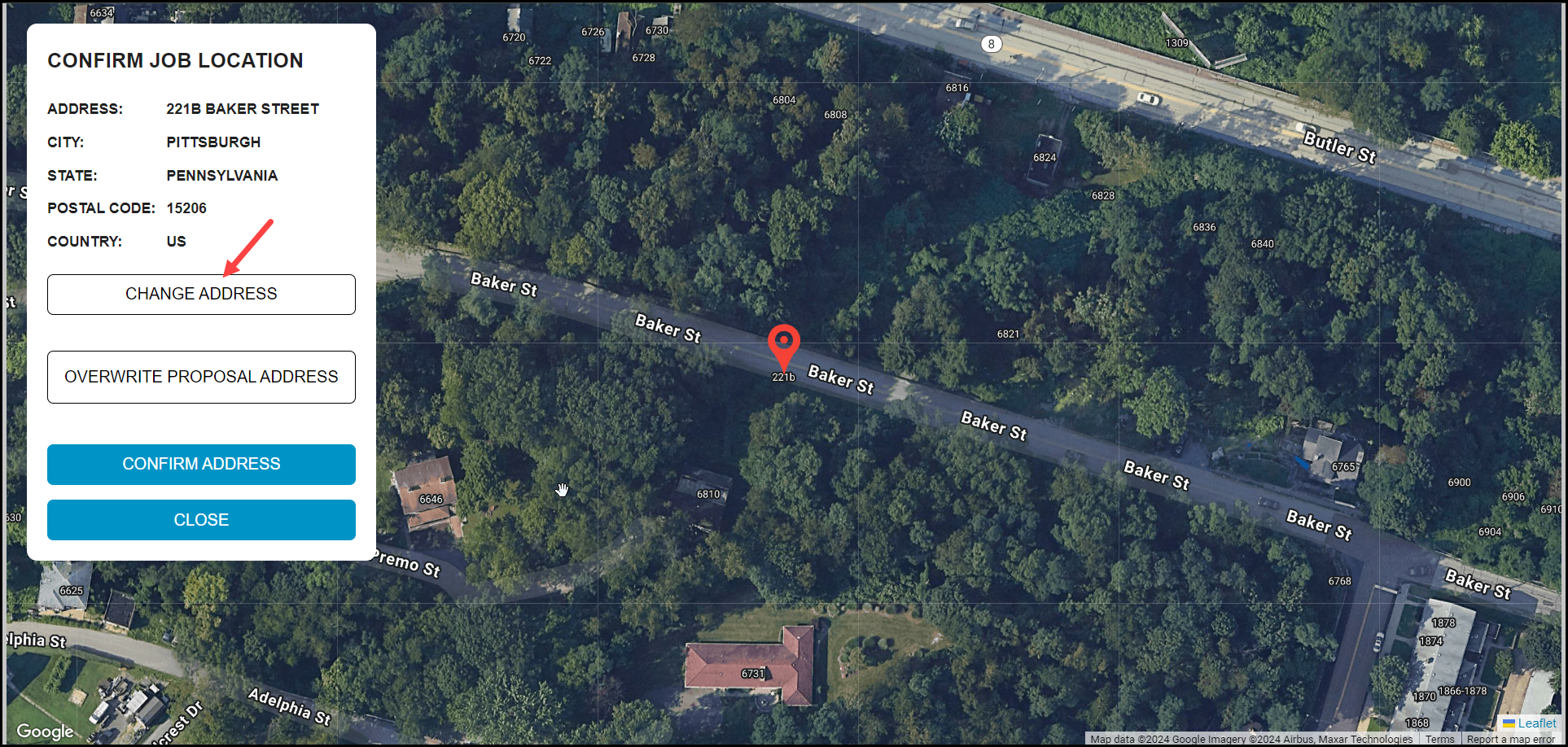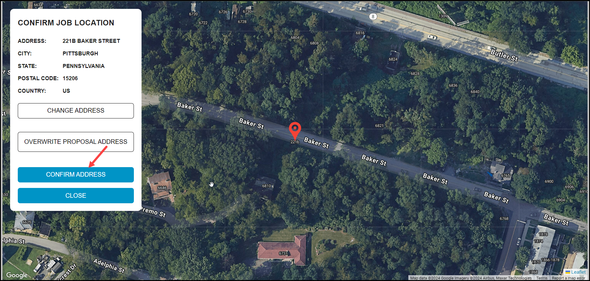 4. In this view, the location of the Job is defined. All other Products in the Stage use this same address. Also, when measuring areas for each Product, the Map opens to this exact location each time.